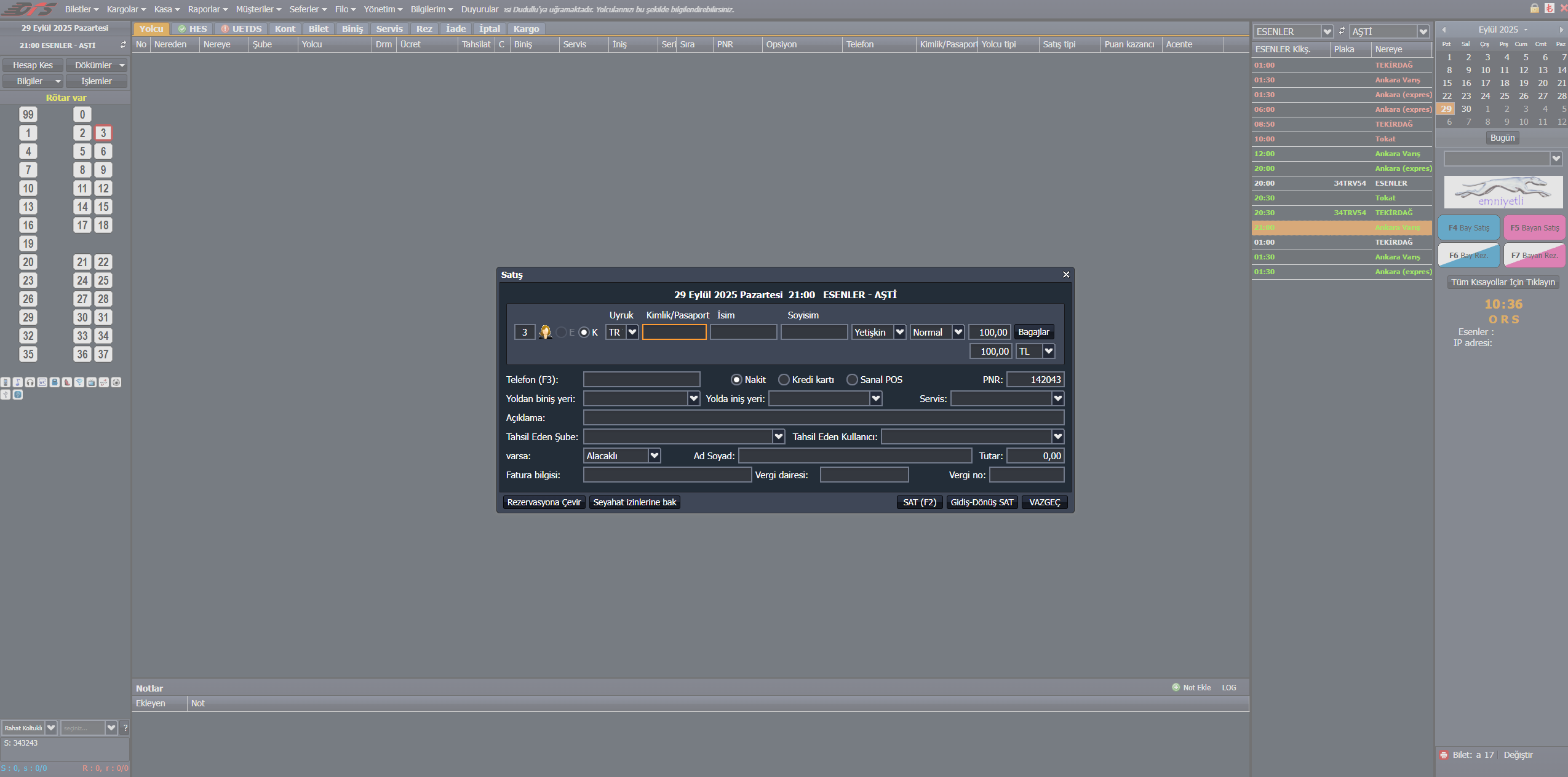 Koltuk seçimi, açık bilet, iptal/iade, PNR, promosyon kodları, kanal bazlı fiyat ve kota yönetimi.